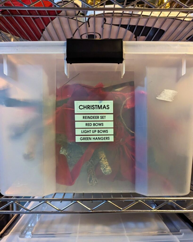 Clear, labeled bins are a game changer. Use sturdy plastic containers with printed labels like “Fall – Mantel” or “Christmas – Outdoor Lights.” You can even color-code bins by season (orange lids for fall, red for Christmas, pastel for spring). This makes finding what you need as simple as a glance.